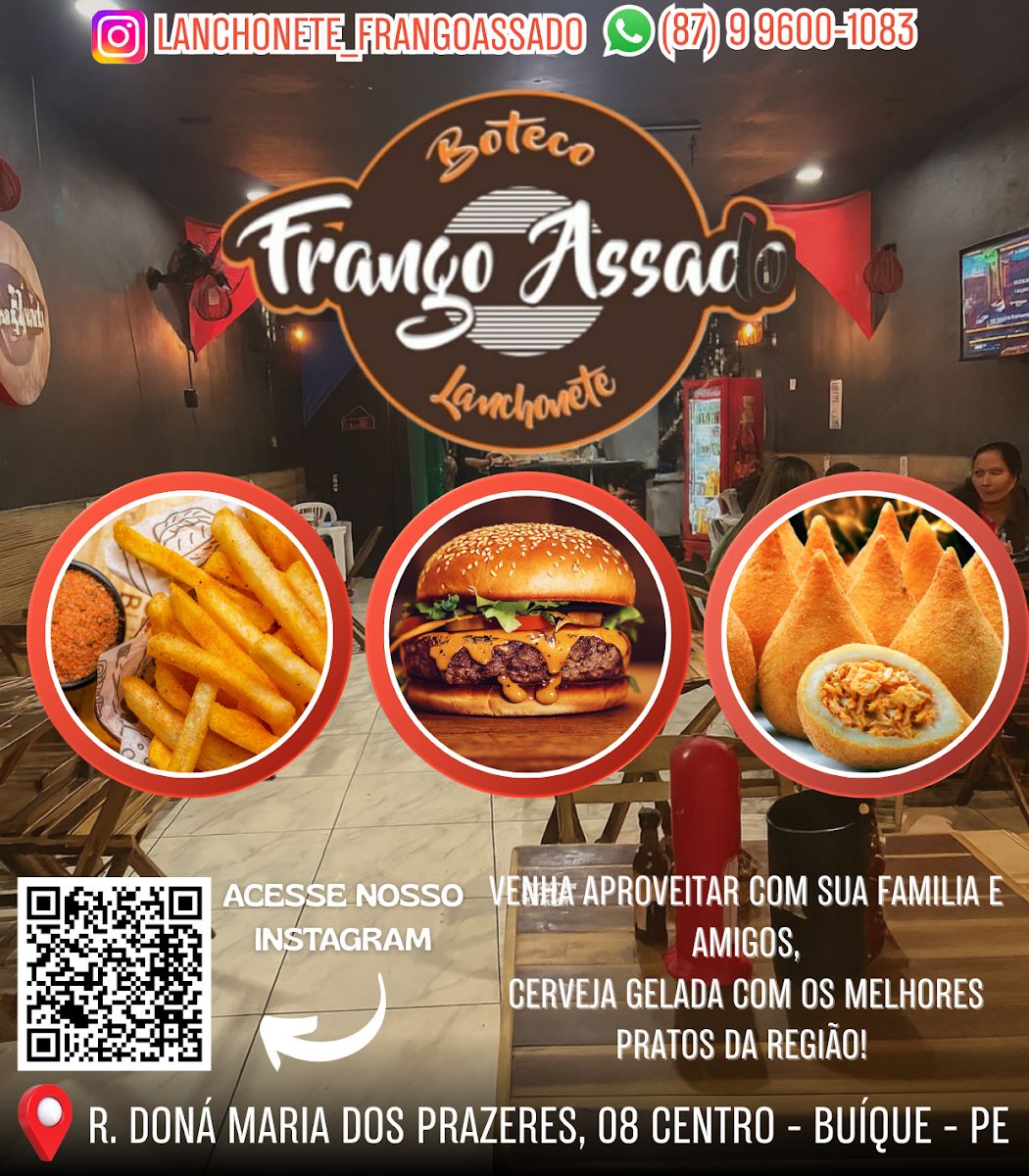 Introducing Lanchonete Frango Assado, a delightful chicken restaurant nestled in Buíque, Brazil. Renowned for its relaxed ambiance and welcoming atmosphere, this eatery stands out for its exceptional service and affordability. Guests rave about the diverse menu, which features not just scrumptious chicken dishes, but an array of delicious snacks and drinks—both local and imported. The spot is perfect for quick bites as well as enjoying leisurely meals with friends and family. Customers like Marina Michelle and Tibério Barbosa praise the flavorful drinks and the cozy environment that fosters memorable dining experiences. Whether you're grabbing a quick lanche or savoring a delightful meal, Lanchonete Frango Assado guarantees tasty offerings that cater to all preferences. If you're in the area, don’t miss the chance to indulge in their specialties and discover why locals can't get enough of this eatery.